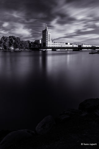 A timed exposure calms the river's water and smooths the passing clouds of the Register Star news tower in downtown Rockford, Illinois.