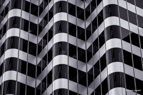 An abstract detail taken in the dusk glow in downtown San Francisco of the iconic Shaklee Terraces building designed by architects Skidmore, Owings & Merrill.