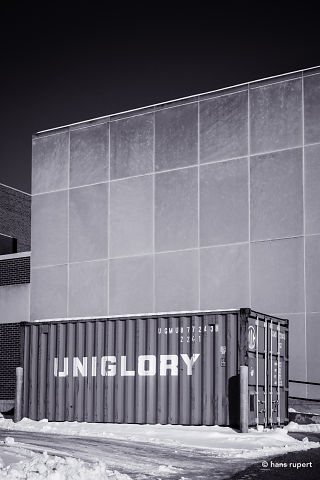 Uniglory   An orange shipping cotainer with the name, "UNIGLORY" sits outside under the deep blue sky and crisp white snow of a hospital loading dock.